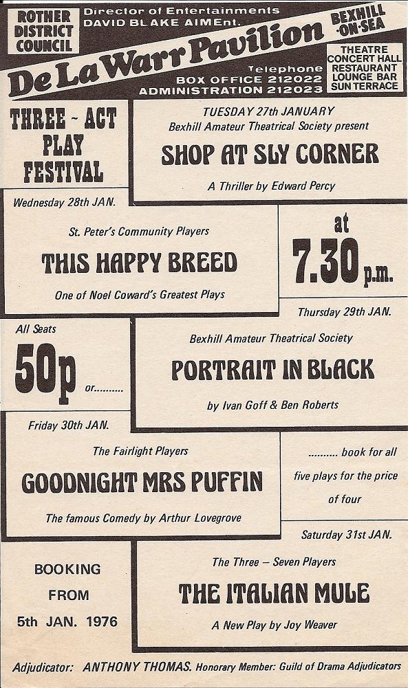 I note that the Players were "up against" the BATS (Bexhill Amateur Dramatic Society) who entered two plays to the Festival, and who are still alive and kicking in 2010. Whether the other two entrants are still active I know not - perhaps somebody will be able to enlighten me.
