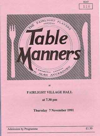 Table Manners is part of a trilogy under the general headding The Norman Conquests - the two other plays being Living Together and Round and Round the Garden. The plays are not consecutive, and thus it does not matter in which order they are performed, but all take place in the same "Victorian vicarage-type house" during a single weekend in July. In the case of the Fairlight Players, this weekend lasted some 11 years, since the other two plays would be performed in 1994 and 2002 respectively.